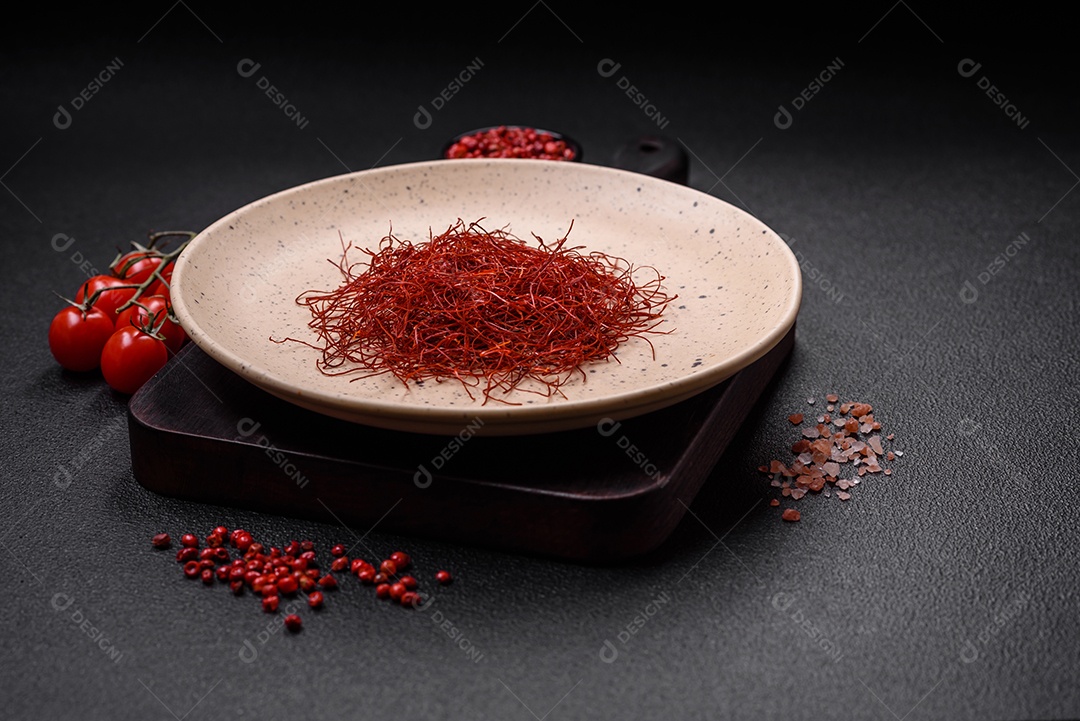 Fios finos vermelhos de pimentão quente em um fundo escuro