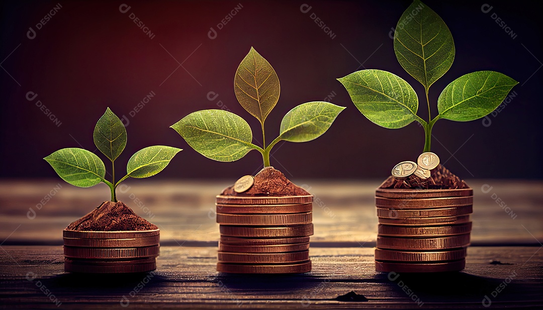Fileira de pilhas de moedas com uma planta crescendo nelas. Folha d...