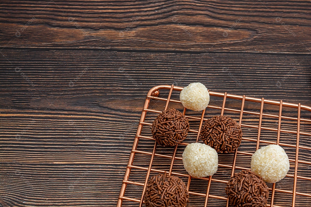 Brigadeiro brasileiro e beijinho tradicional deliciosa sobremesa de chocolate, salgadinhos de festa, fundo de polvilho doce vista superior sobre a mesa de madeira