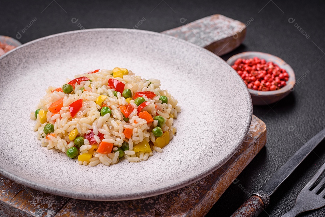 Delicioso arroz cozido branco com legumes, pimentões, cenouras, ervilhas, sal e especiarias sobre um fundo escuro de concreto