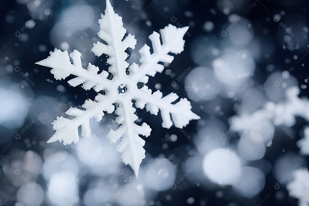 Lindo floco de neve isolado destacado com sombra no fundo azul escuro.