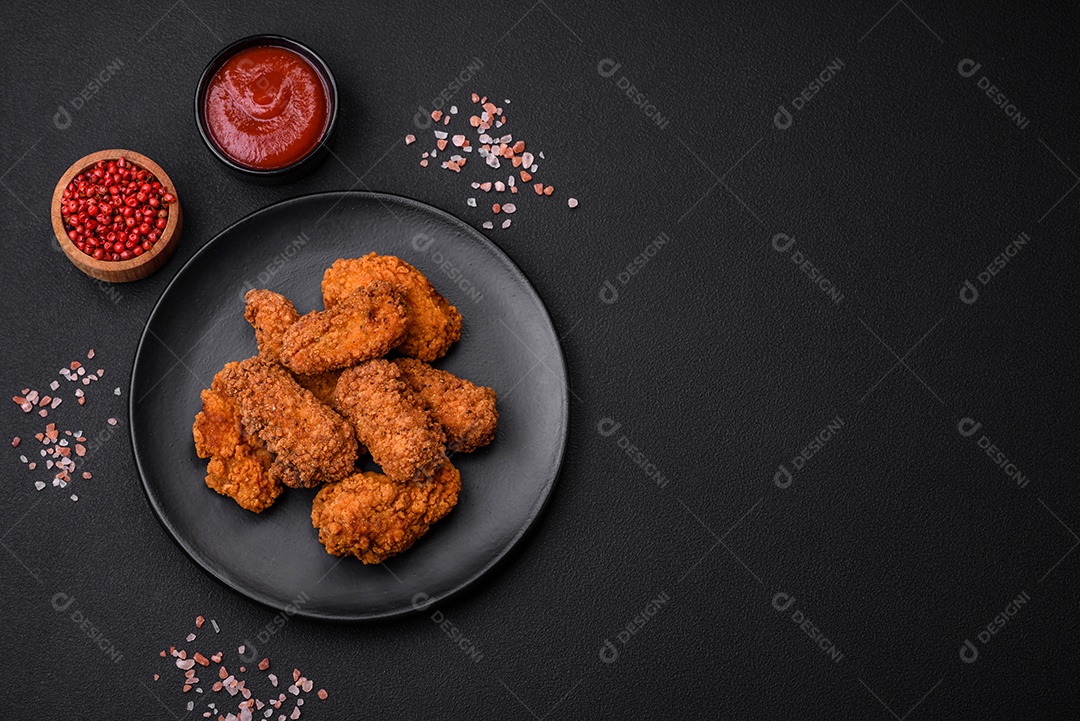 Deliciosas asas de frango empanadas crocantes grelhadas com especiarias e ervas em um fundo escuro de concreto