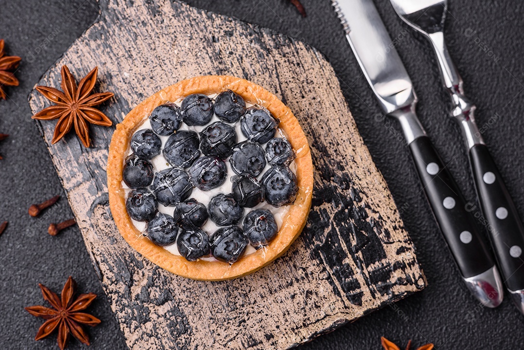 Deliciosa torta redonda doce e fresca com mirtilos maduros e creme sobre um fundo escuro de concreto