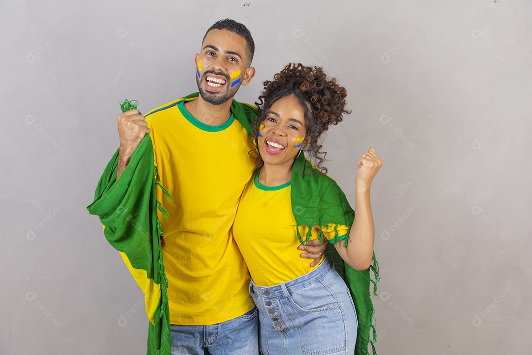 Homem e mulher casal jovens brasileiros torcedores copa do mundo Fu...