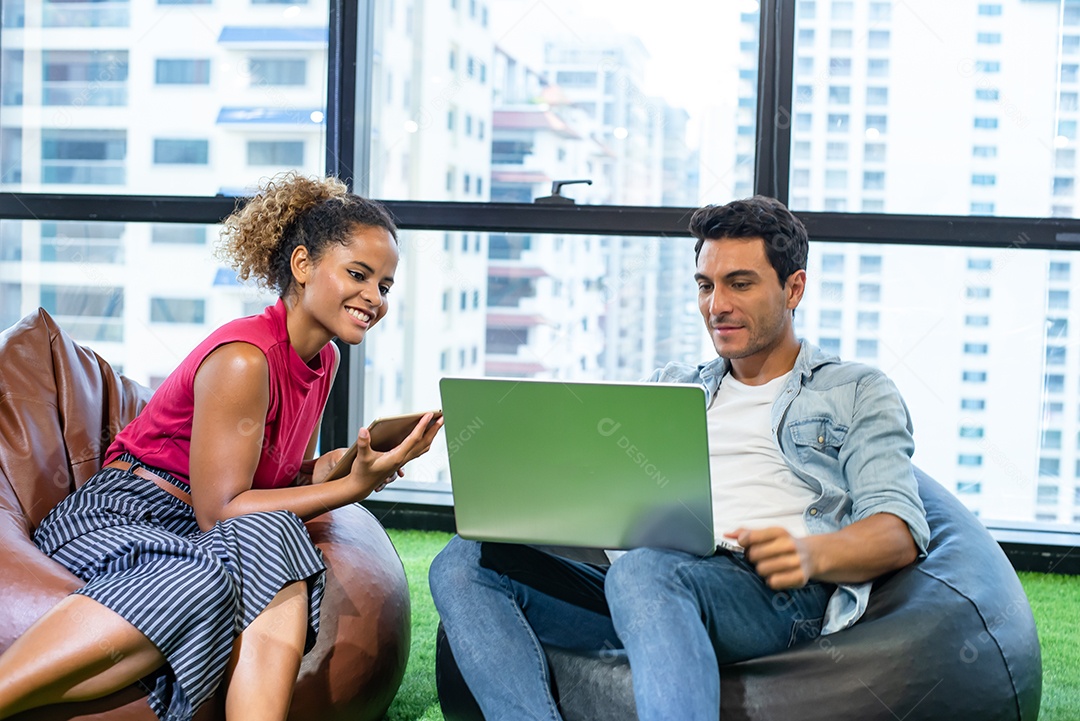Jovem olha a câmera e a mulher africana usa o notebook no escritório moderno.