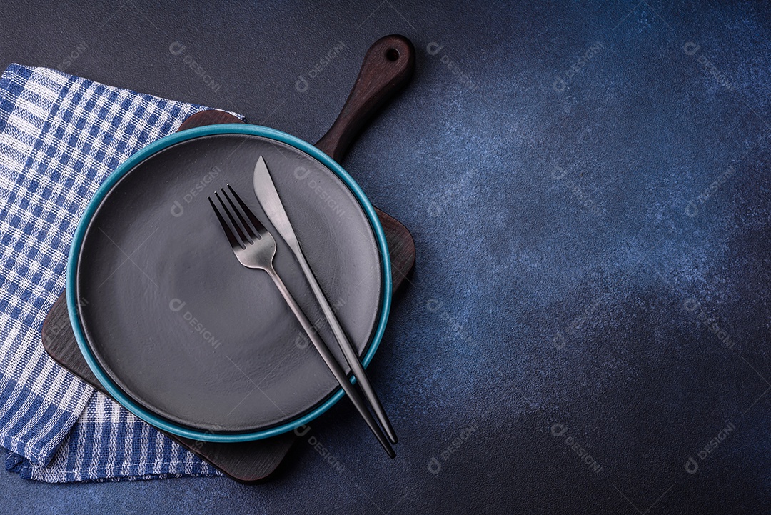 Placa cerâmica colorida vazia redonda em fundo de textura de concreto. Preparando pratos e talheres para o jantar