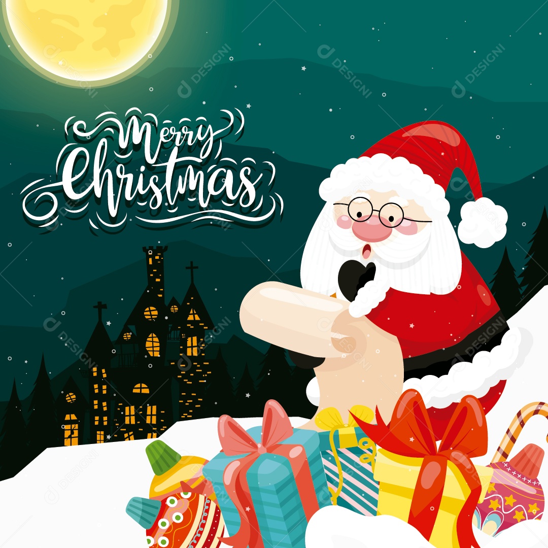 Feliz Natal Com Papai Noel e Várias Caixas de Presente no Fundo Nevado Com Casa e Lua Como Pano de Fundo Vetor EPS