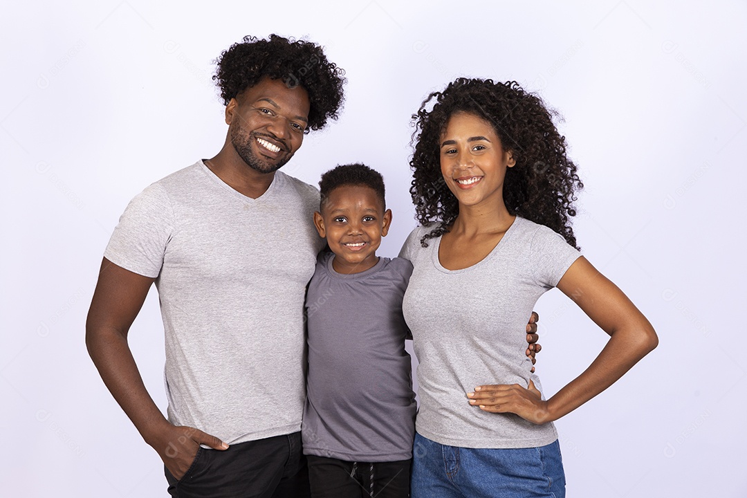 Mãe e pai feliz ao lado de seu filho sobre fundo isolado branco
