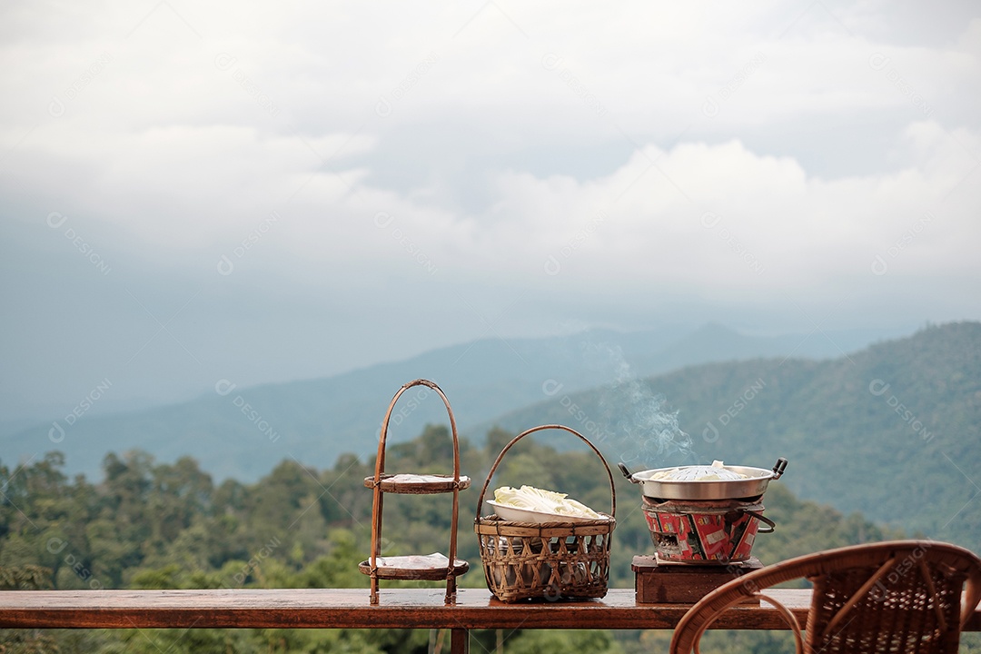 Carne de porco ou carne com legumes e sopa na panela quente.