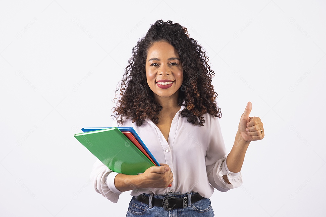 Linda mulher jovem cabelo cacheado segurando material escolar sobre fundo isolado