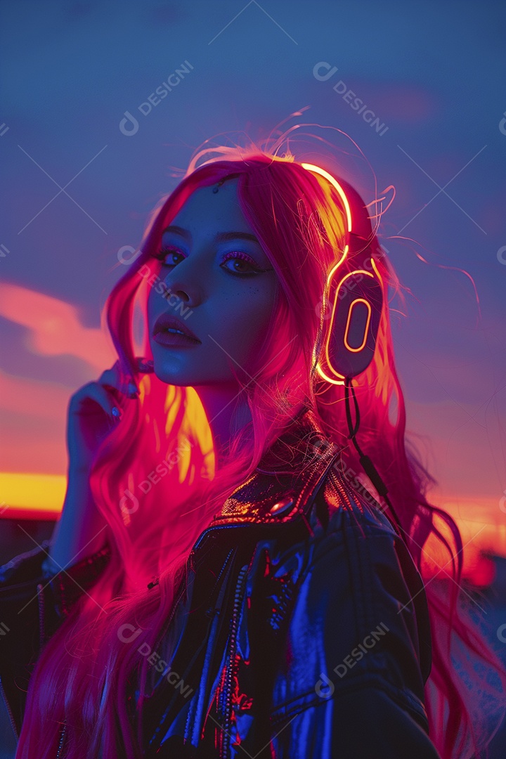 Mulher ruiva com fones de ouvido posando à noite com um pôr do sol