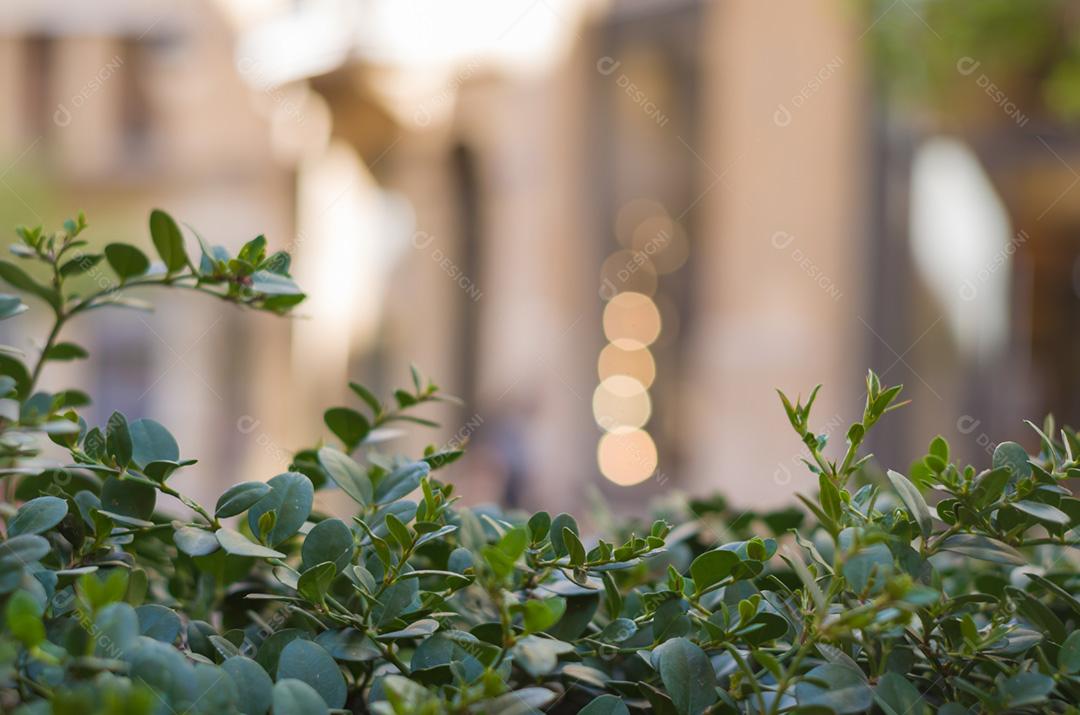 Folhagem verde com fundo desfocado da cidade sem fundo, imagem para planos de fundo.
