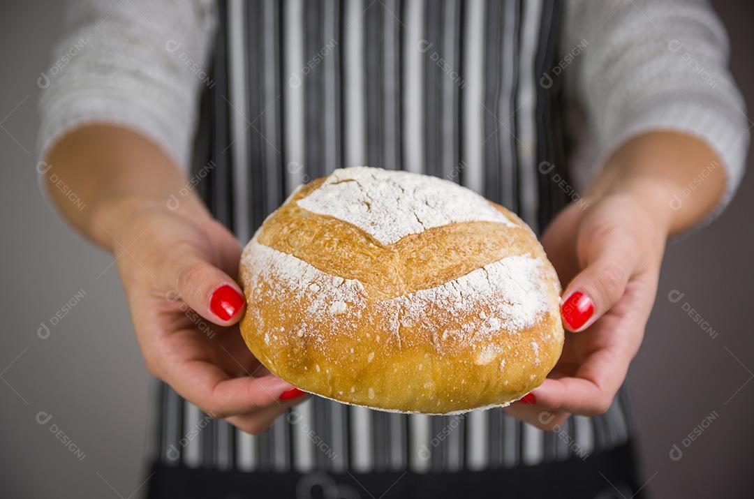 Pão de fermento bonito sendo realizado pelas mãos da mulher.
