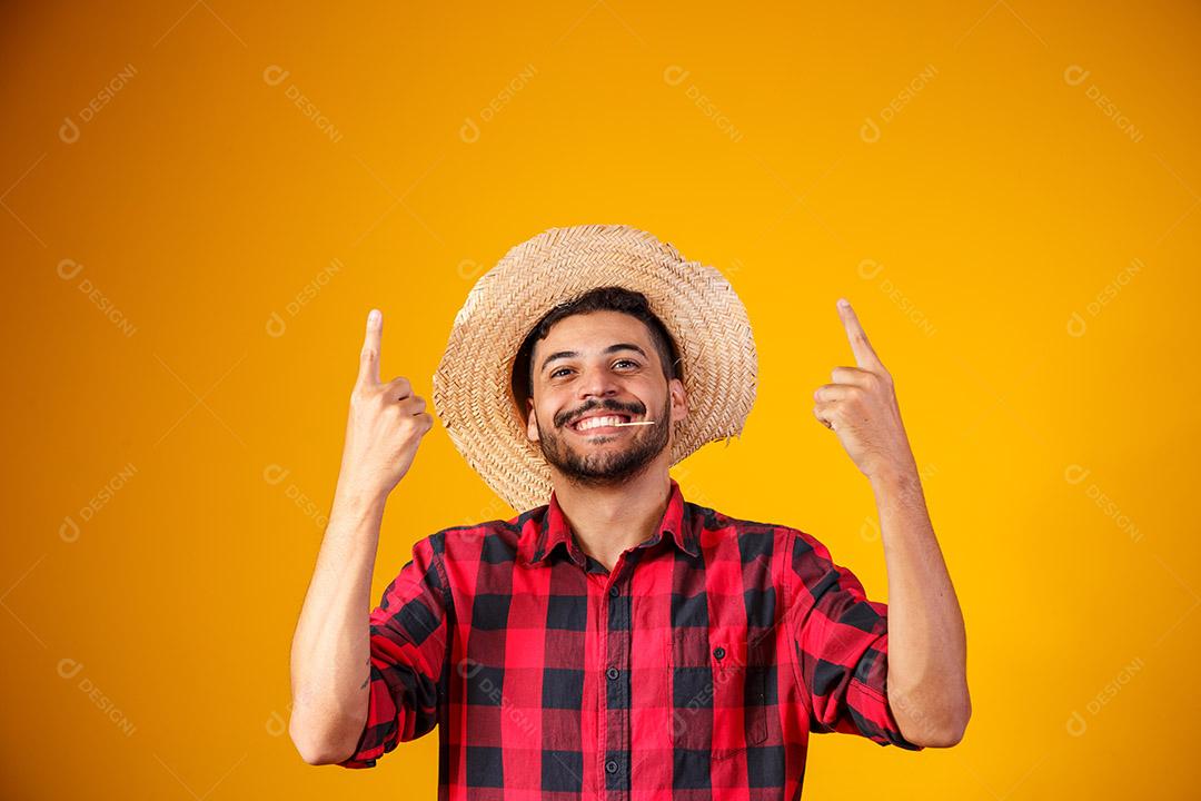 Homem brasileiro vestindo roupas típicas para a Festa Junina apontando para o lado com espaço para texto