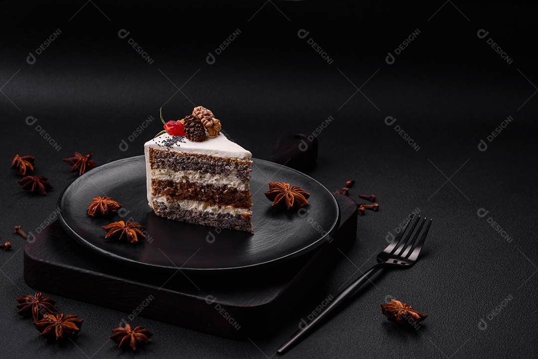 Delicioso lindo pedaço de bolo com creme e frutas em uma placa de cerâmica preta sobre um fundo escuro de concreto