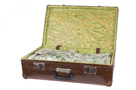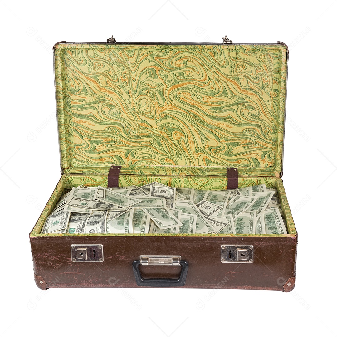 Uma velha mala fechada de fibra marrom com notas de dólar salientes