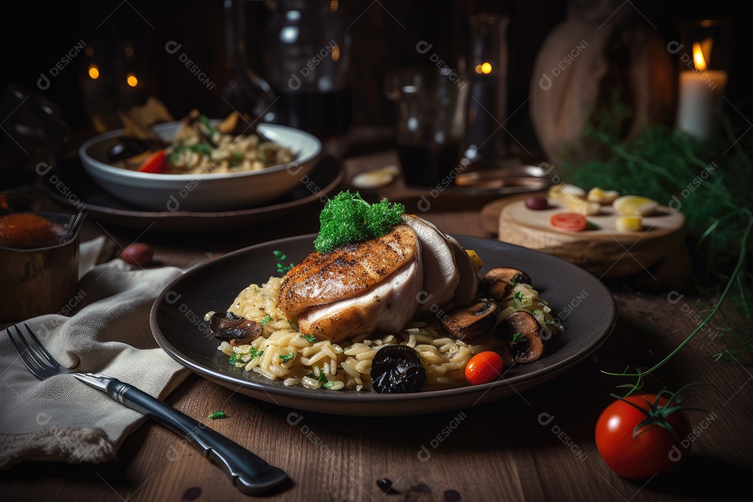 Festo delicioso com risoto, cogumelos e frango grelhado.