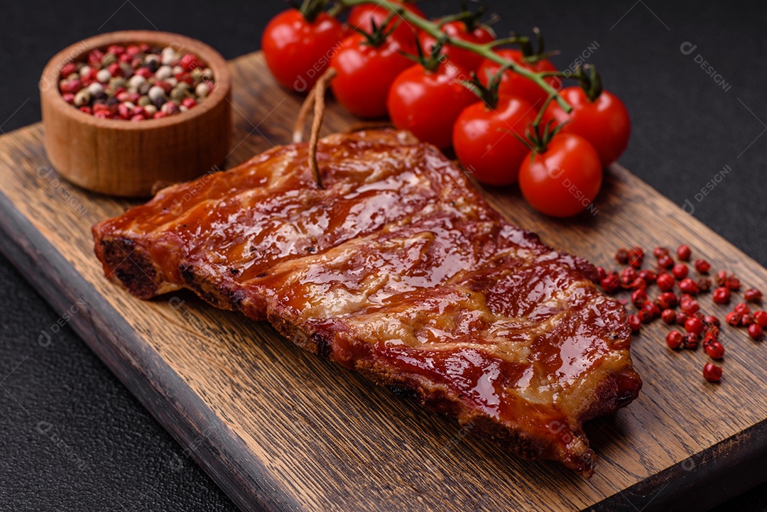 Deliciosas costelas grelhadas assadas na grelha com sal, especiarias e ervas sobre um fundo escuro de concreto