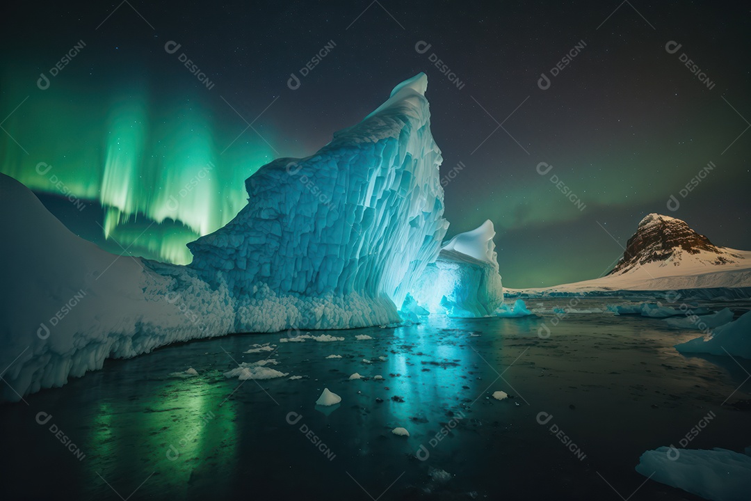 Um belo e grande iceberg no mar da Península Antártica com a Aurora Boreal ao fundo