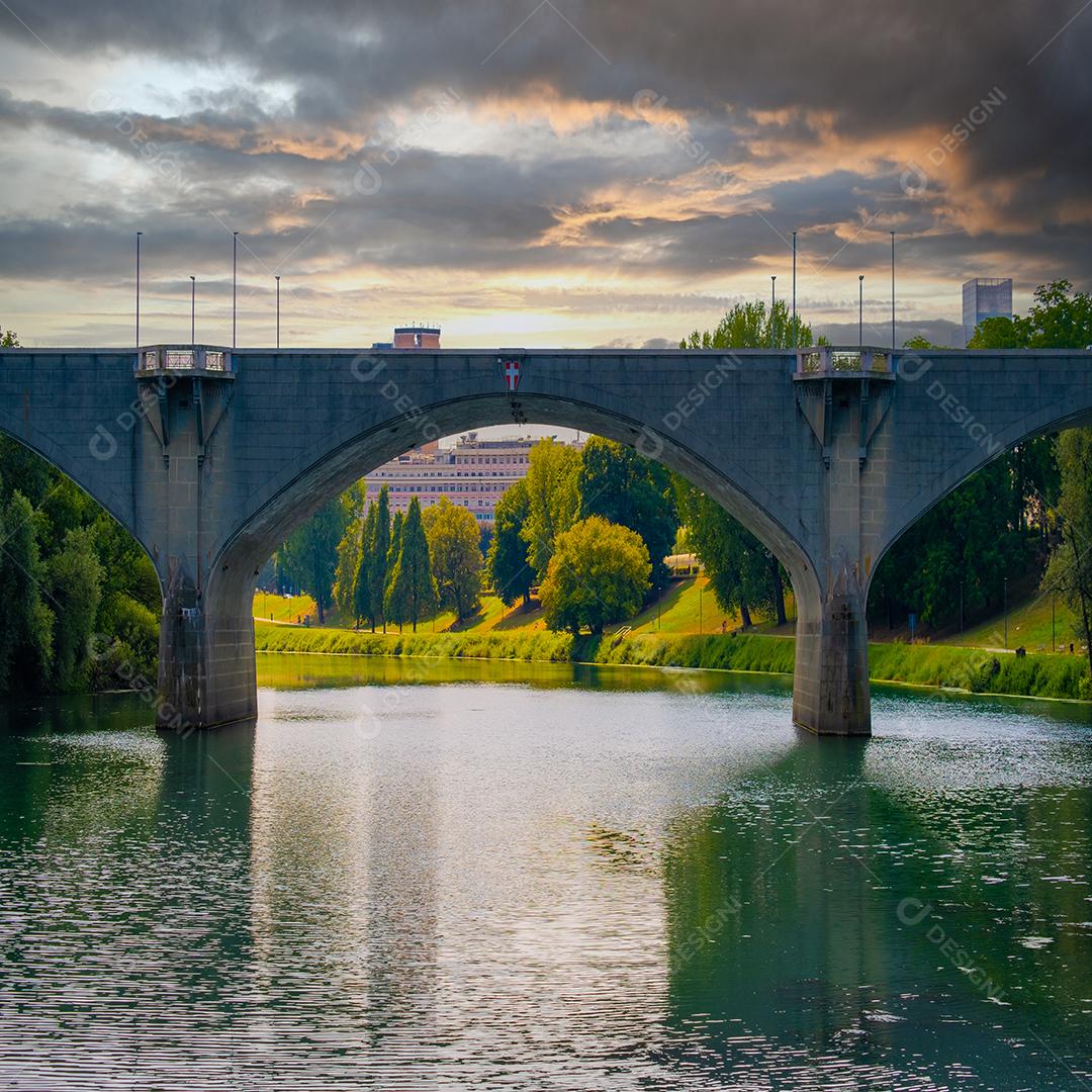 Bela vista do pôr do sol da ponte em arco sobre o rio Po na cidade ...