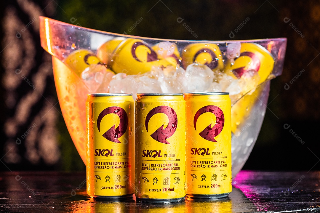 Balde de cerveja gelada Skol sobre uma mesa de bar