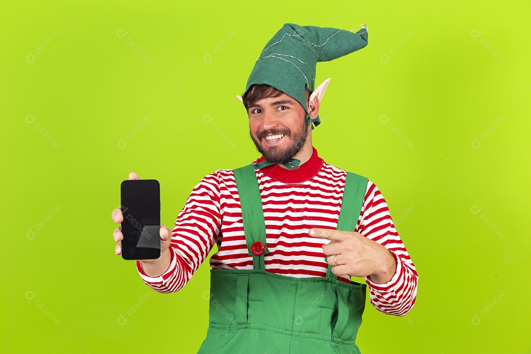 Homem com fantasia de duende segurando celular em fundo verde