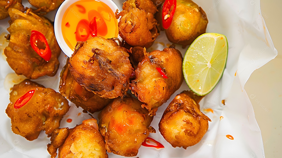Bolinhos de bacalhau fritos servidos com limão e molho picante