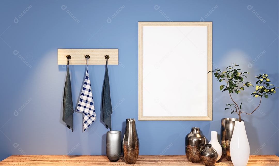 Placa grande de maquete de ilustração 3D com moldura na sala de jantar com cozinha em casa, cores pastel interiores de estilo escandinavo e decoração com móveis bonitos e confortáveis, renderização