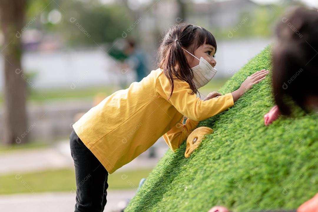 Linda garota asiática se divertindo tentando subir em pedregulhos artificiais no pátio da escola, menina subindo a parede de pedra, mão & Coordenação Ocular, Desenvolvimento de Competências