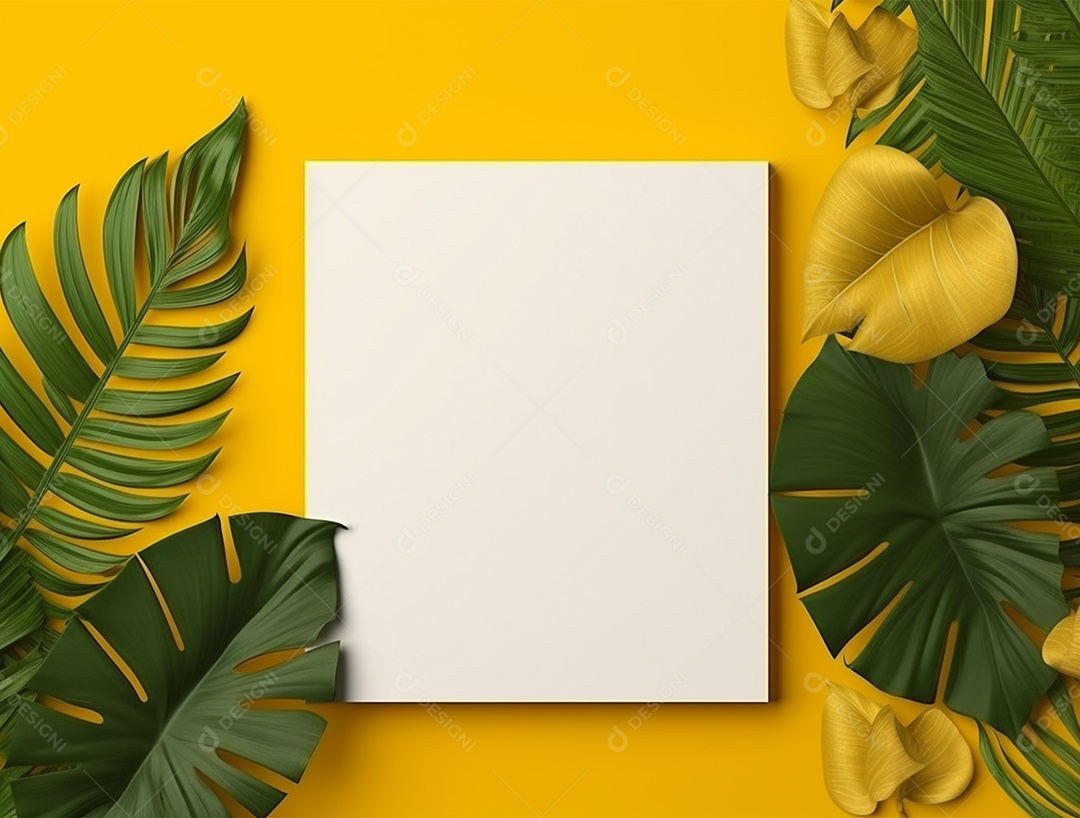 Papel em branco sobre fundo amarelo com folhas.