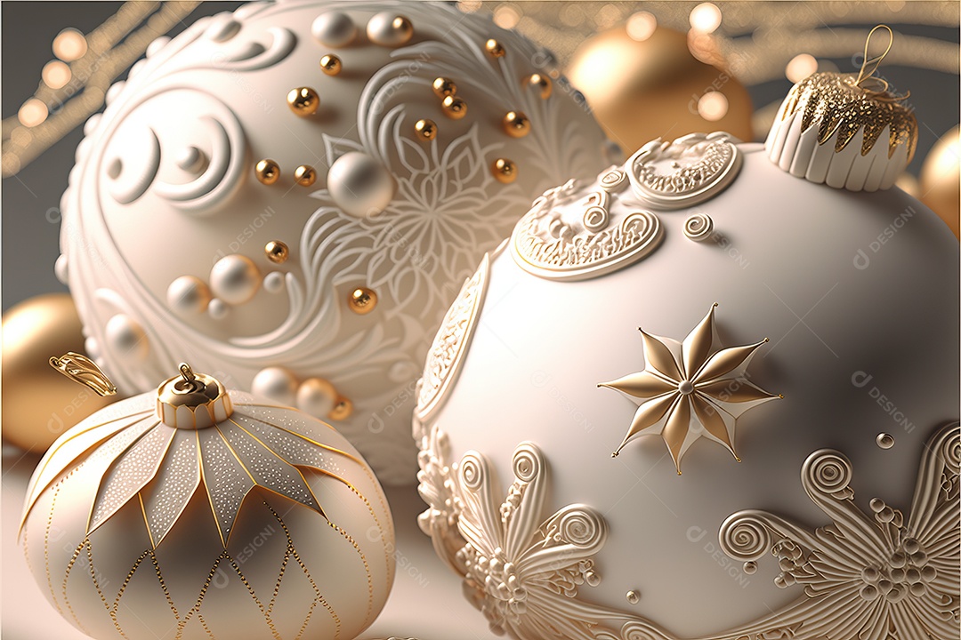 Close-up de enfeites na árvore de Natal com guirlandas em fundo colorido com foco seletivo e fundo desfocado.