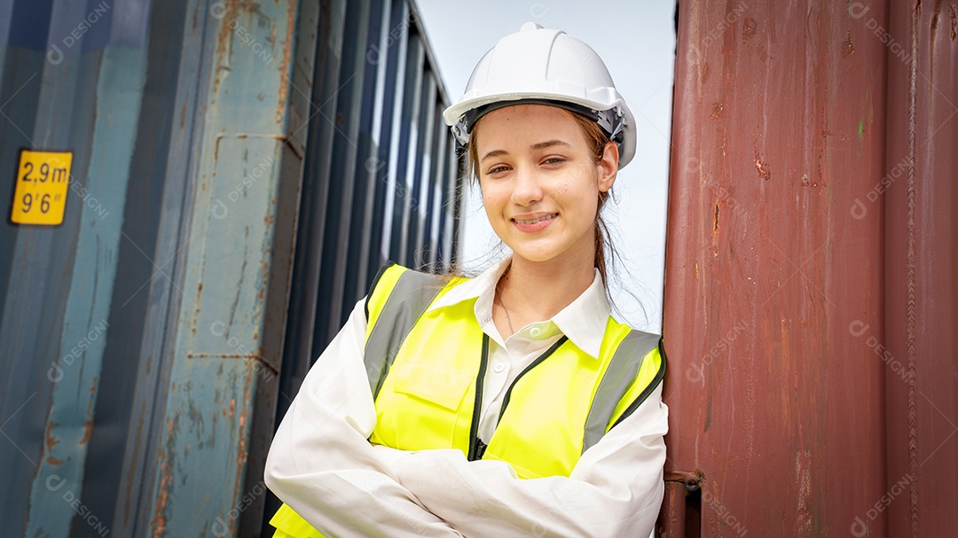 Mulher capataz sorri ao lado do contêiner de carga no armazém, gere...