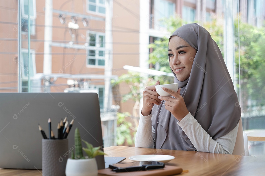Mulher de negócios muçulmana linda sorridente bebendo café quente