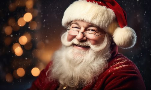 Retrato do simpático e bonito Papai Noel em sua casa sorrindo e olhando sorrindo para a câmera