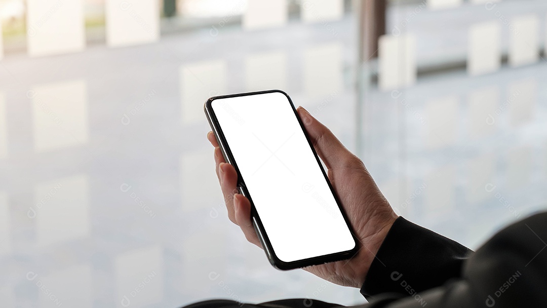 Mão de uma mulher segurando o telefone celular com tela em branco
