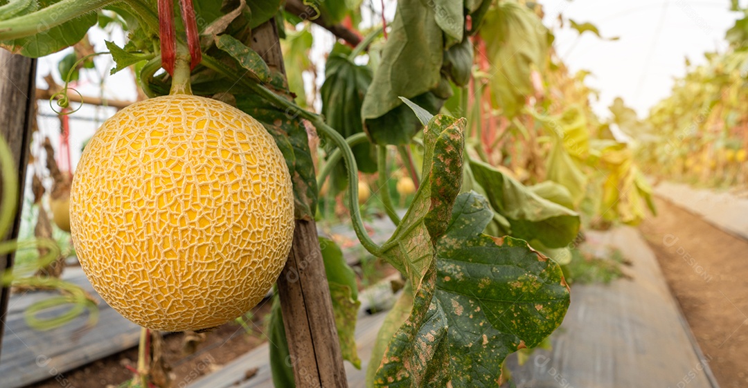 Frutas de melões orgânicos amarelos ou melão na casa verde de plant...