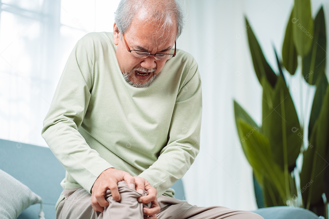 Homem sênior asiático sente dor no joelho.