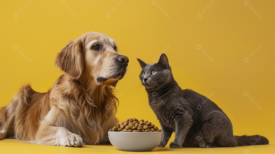 Linda cena cachorro e um gato sentados lado a lado ansiosos por tigela cheia de ração