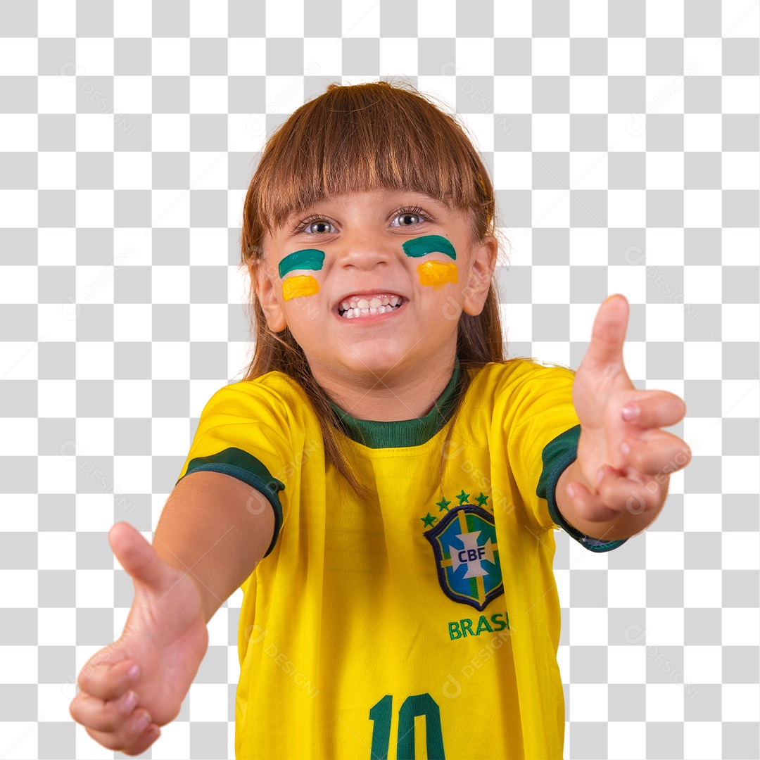 Menina loira de olhos claros vestida com camiseta do Brasil, Mine torcedora brasileira