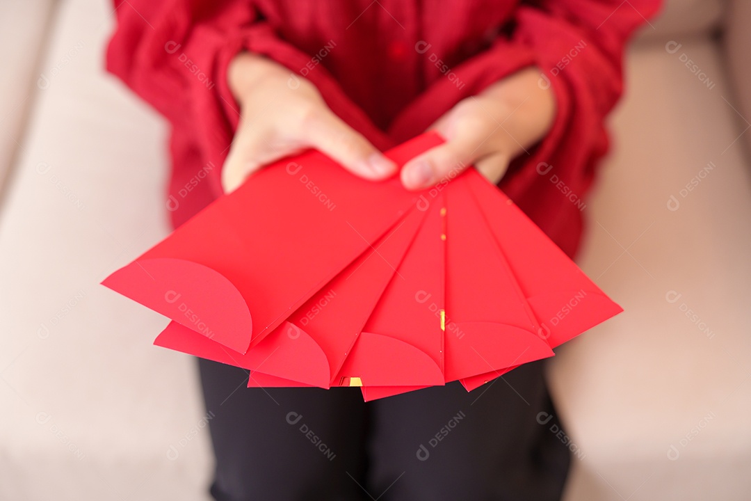 mulher segurando o envelope vermelho chinês com coelho dourado e pa...