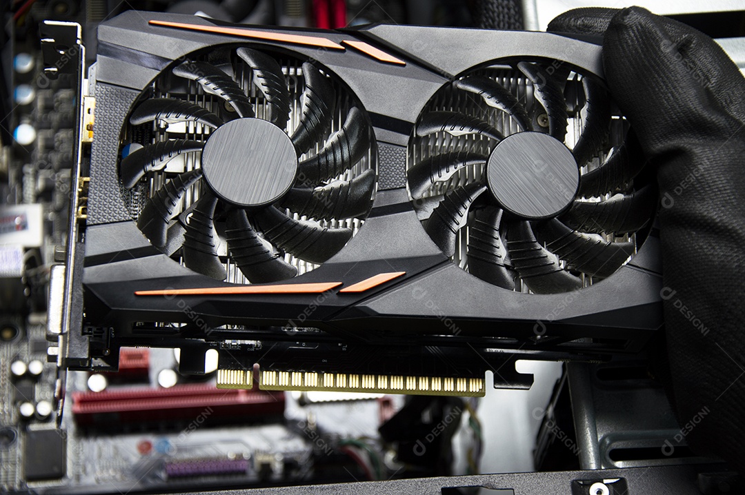 Vista superior de uma placa gráfica sendo segurada por um técnico