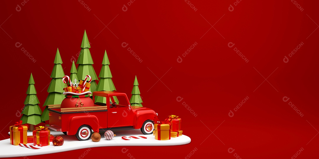 Banner de Natal do caminhão de Natal com sacola de presentes na floresta de pinheiros, ilustração 3d
