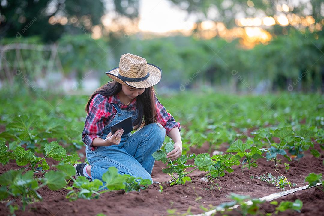 Mulheres da Ásia Agrônoma e agricultora usando tecnologia para inspecionar em campo de vegetais agrícolas e orgânicos