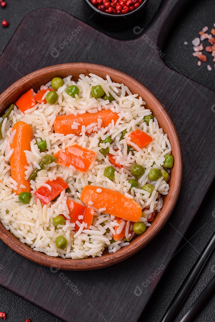 Delicioso arroz cozido com legumes ou risoto com sal, especiarias e...