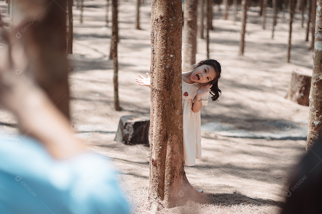 Menina brincando se escondendo atrás da árvore e acenando com a fam...