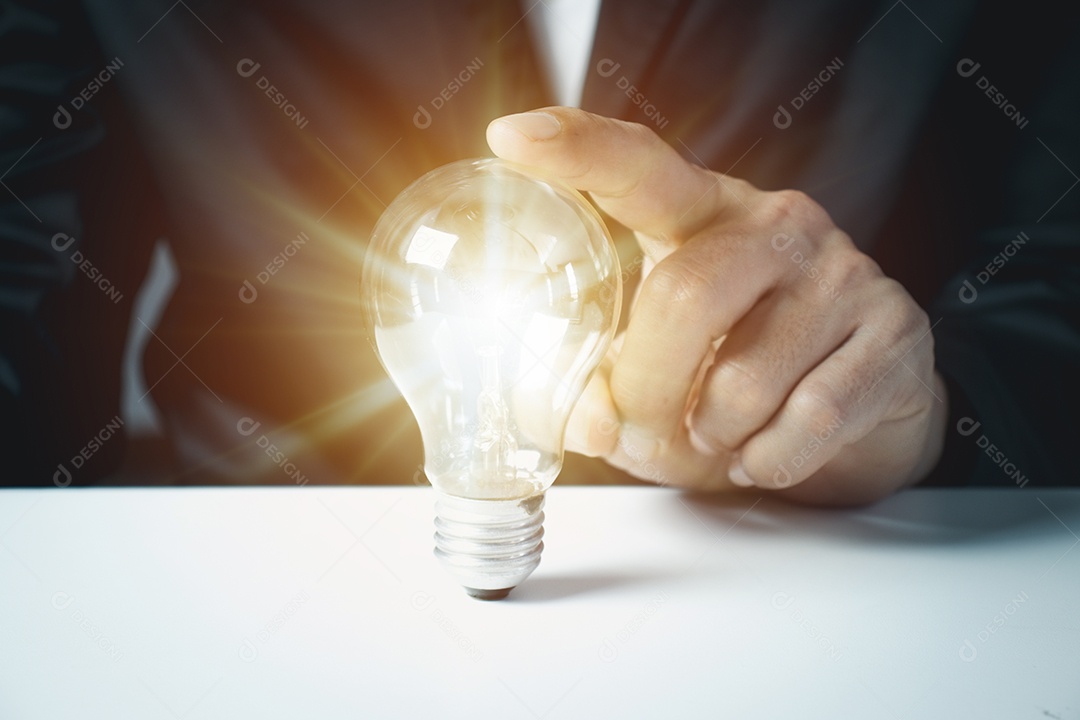 Mão de empresário segurando a lâmpada com documento financeiro e fe...
