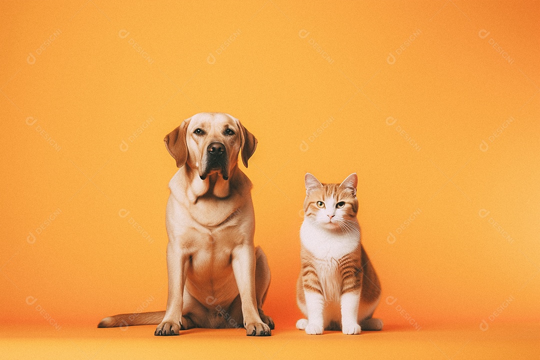 Cachorro e gato sentados para foto isolada no fundo laranja do estúdio