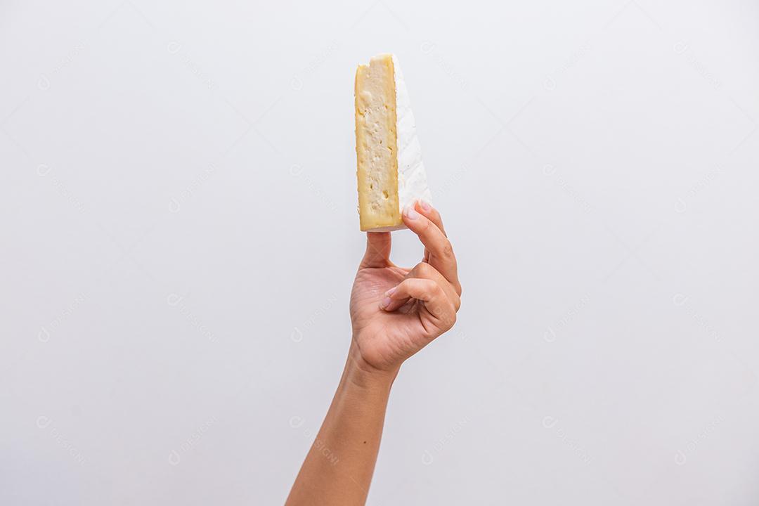 Mão segurando um pedaço de queijo elementar.