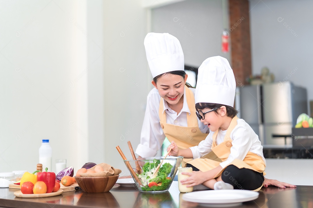 Chef profissional mãe asiática ensinando menu de lista de filho pequeno cozinhando vegetais