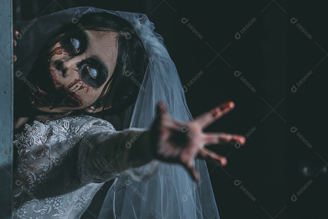 O retrato da mulher asiática compõe a morte da noiva fantasma e o sangue, o horror é a cena de terror assustador da escuridão para o fundo, conceito do festival de Halloween.